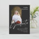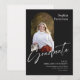 This 5" x 7" flat graduation announcement features an arch shape photo on the front on a black background with white lettering. Placeholders include, graduate name, college or university name, the degree, the degree area of focus and an added line for additional information such as special honors.
