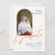 This 5" x 7" flat graduation announcement features an arch shape photo on the front on an ivory background with black lettering. Placeholders include, graduate name, college or university name, the degree, the degree area of focus and an added line for additional information such as special honors.