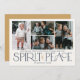These simple holiday photo greeting cards feature the greeting, "Wishing you a Merry Christmas and a Happy New Year," along with the greeting, “Spirit of Peace,” in large navy and gold letters on an ivory background with placeholders to add four of your favorite photos, family name & the year.