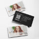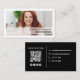 A simple design features a QR code business card template, with a simple photo, and a modern professional style, with a scannable barcode for a website or social media, a minimalist, trendy chic design, with minimal contact details, and a black and white background on the back, a photography picture text overlay business card.