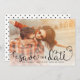 These simple photo save the dates feature charming hand-lettered calligraphy script. Overlaid on your photo with a white fade at the bottom (you can remove this if you don't need it via Zazzle's customize/personalize tool). A cute polka dot background finishes off the design!