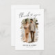 Minimalist wedding thank you cards featuring a simple white background, a photo of the bride and groom, the words "thank you" in a elegant script font that incorporates a love heart, their names, wedding date, and a personalized thank you note on the back.