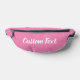 This pink fanny pack has text in white script. The text can be edited or deleted to show a custom message such as a name.