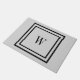 Simple, classic or modern, and stylish. Features 2 black stripe borders, an inner and outer border. Just personalize with your last name initial, or full monogram in the center. For 3 initials, customize and pick the text number size 72 to reduce it to fit. On a masculine gray background, or customize and change to a darker gray, white, or any color. Use eyedropper to seem more color choices. Fits the small product only. For yourself, or makes a nice gift for a housewarming, or for as a wedding or bridal shower.