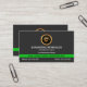 A simple plain design kept to a minimum using a striking green stripe at the foot of the card as the accentuating item ; Here lies the business name with the contact details near the base. At the top rest a gold tire logo you can use followed by your prestigious name, the job title and a slogan option to publicize your services.
