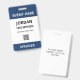 Practical no nonsense event ID badge personalized with name, company, role, and QR code in dark blue.