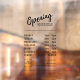 Introducing our Simple and Professional Business Opening Hours Black with Logo window decal, designed to enhance the visibility and professionalism of your storefront. Perfect for any business, this modern minimalist decal clearly displays your opening hours and business logo, ensuring customers are well-informed. The simple and clean, black design with transparent background seamlessly blends with any business aesthetic, providing a simple yet elegant look. Ideal for use on business windows, this custom window cling also includes space for your phone number and social media handles, allowing customers to connect easily. Whether for a restaurant, retail store, or office, this opening hours window decal helps you present a polished and professional image.