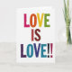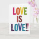 This card features the message “LOVE IS LOVE!!” centered on a white background, stacked in three lines from top to bottom. The letters look slightly uneven, like they were cut and placed by hand, which makes the message feel human and real. The top line, “LOVE,” uses fuchsia, orange, yellow, and green letters that feel bright and happy. In the middle, “IS” is done in red and deep maroon, adding a steady, warm note. The bottom line, “LOVE!!” mixes purple, teal, indigo, and cyan, followed by two exclamation marks in black and magenta. The text is in big, simple printed letters, and the strong contrast against the white space makes it easy to read right away. It’s a meaningful card to give because it supports love in all forms and says “I’m with you” in a clear, caring way 🥰❤️.