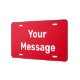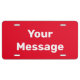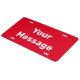 This red license plate has white display text. You can edit it to show a custom message that promotes a business, highlights a hobby, or celebrates a cause.
