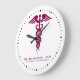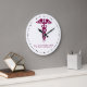 A clock with a stylish red caduceus symbol. Simple minimalist design.