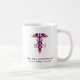 A mug with a stylish red caduceus symbol with the letters R N on either side. Simple minimalist design. Personalize with your name and title.