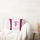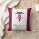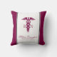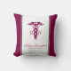 A white pillow with a stylish red caduceus symbol with the letters R N on either side. Burgundy borders. Personalized with your name and title.