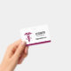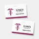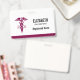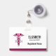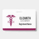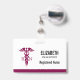 Personalized name badge with a stylish red caduceus symbol with the letters R N on either side. Reddish maroon border.