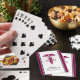 Personalized playing cards with a stylish red caduceus symbol with the letters R N on either side. A reddish purple border with a black stripe on either side.