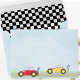 This fun race car envelope with the return address printed on the back flap with black and white checkered, 5x7, matching, blue, race car theme, with a minimal, and whimsical fun design. With matching red and yellow race cars.