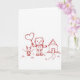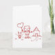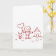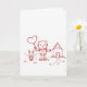 This greeting card shows a simple red line drawing on a white background, with most of the space left open and light. Near the bottom center stands a cute little robot with a round head and a small, happy smile. One arm reaches up to hold a big heart-shaped balloon, floating above like a clear sign of love ❤️. To the robot’s left is a tiny creature with big ears and an excited face, with a few wavy lines around it that make it feel lively and friendly. On the right side sits a small house with a pointed roof, a door, and a curving path that leads toward it, giving the scene a cozy, homey feel. There isn’t any printed wording on the front, so the picture does the talking and leaves room for your own note inside 🥰. It feels meaningful because it’s about simple companionship—showing up for someone, sharing warmth, and feeling at home together, perfect for sharing Valentine’s Day