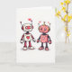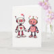 This design shows two cute, human-like robots standing close together on a plain white background. The robot on the left is mostly white with red details on its antenna, eyes, and joints, and it has a bright red heart on its chest. The robot on the right is soft pink with small golden touches on its antenna and a little crown, plus a pink heart on its middle. Both robots are smiling, with one looking calmly happy and the other looking extra excited. Two red hearts float above their heads, making it clear they care about each other ❤️. There isn’t any text on the front, so the picture does all the talking and leaves room for your own words inside. It feels meaningful to give because it shows affection in a simple, sweet way that fits romance or close friendship 🥰, and it’s a friendly way to share Valentine’s Day sentiments.