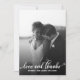 Modern and elegant wedding thank you photo card featuring a white handwritten script on the front "love and thanks" with white hearts and an elegant black and white striped pattern on the back.