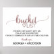 This simple rose gold calligraphy bucket list sign is perfect for a modern wedding. The minimalist design features an elegant brush script font and a lovely feminine heart in faux rose gold foil. Personalize the sign with the names of the bride and groom.
