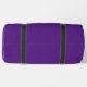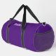 This royal purple duffle bag has text in white script. The text can be edited or deleted.