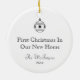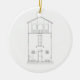 New Home Ink Drawing Black and White New Home First Christmas Double-Sided Round Ceramic Ornament. Keep drawing of house on front or upload your own image. All text on back can be customized. This image is from my original ink on mylar hand drawing of a small rustic cottage with charming architectural details and small stone benches each side of door.
