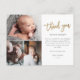 This Simple Script 3 Photo Collage Baby Thank You Card features modern gold handwritten calligraphy thank you and personal message on the front. Click the personalize button to customize this design with your photos and details.
