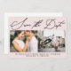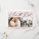 This simple script two photo modern and minimal save the date card features a blush pink front, and a white back.
