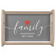 A simple modern personalized serving tray featuring the word family in an elegant script white text with a love heart above. You can personalize your family name and the date that is set in classic white typography. Designed by Thisisnotme©
