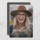 A simple classic script "graduate" in white accentuates a single vertical photo of your grad. This graduation announcement works for both college or high school graduates and is simple enough to let your photo shine. It's a timeless design and also features a striped backer with a customizable color (default is charcoal gray).