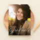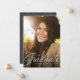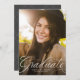 A classic and elegant script graduate in white sits at the bottom of a vertical photo. The custom text includes room for the graduate's name and also school and year details. The dark charcoal gray backer has a simple grid pattern, and the color can be changed by clicking "customize further." Announce your graduate's accomplishment to friends and family with this design!