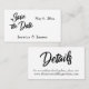 Keep your wedding guests in the loop with all your plans, using these detailed wedding favor insert cards. The minimalist design features pretty typography graphics that read "Save the Date" on the front and "Details" on the back, using an elegant, modern, bold handwritten script font. Use the template fields to add all your own details to personalize this design for your own use. If you'd like to change the versatile, serif font I used for the editable text, or wish to move some lines elsewhere, click the link to customize the card further. All type is in black and was placed over an editable white; you can change this background color to anything you like. // 89 // Designed by Melody Watson for Paper Muserie.