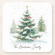 Cute Christmas paper coaster for Christmas party or barware with simple script family name and a watercolor vintage Christmas tree with snow.