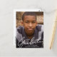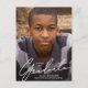 This simple, modern graduation postcard features a white script overlay and full photo. On the front, "Graduate" is displayed along the bottom in handwritten script over a large, vertical photo. Add your graduate's name and photo, graduation year, and school to the front. On the back, you can write a longer message to recipients and/or include graduation party details.