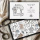 This simple seamstress business card features whimsical watercolor tools of the trade in earthy browns and grays, with a sewing machine and other items, and a collage of seamstress tools on the back of the card.
