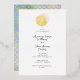 Simple Seashells in gold foil with calligraphy and classic fonts on simple front invitation. Reverses to sea colors of watercolors overlaid with mermaid fish scales in a faux golden effect.