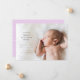 This birth announcement features simple text with a side orientation. The back offers a lilac background that is editable with room for another photo.