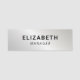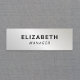Simple modern name tag with a name and title against a silver faux metallic background.