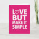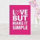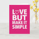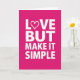 This greeting card features a solid magenta background with a simple, centered message in white capital letters. The text reads “LOVE BUT MAKE IT SIMPLE,” stacked neatly over four lines in a plain, modern letter style. In the word “LOVE,” the “O” is replaced with a small outlined heart, adding a gentle romantic touch. There are no characters or extra objects, which makes the message feel direct and easy to read. The strong contrast between the white letters and the magenta background helps the words stand out right away. It feels meaningful to give because it says you care without needing a long note, and it works for romance or close friendship 🥰. The little heart detail keeps it tender while the rest stays straightforward ❤️. Hope it helps you share Valentine’s Day sentiments with someone you care about.