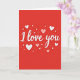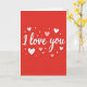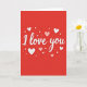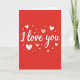 This greeting card features a deep scarlet red background with “I love you” written in flowing white letters at the center. The lettering has gentle curves and light shading, so it looks slightly raised against the red. Around the words, white hearts of different sizes float with small shadows that help them stand out. Softer, see-through pink hearts are mixed in too, giving the space a light, tender feel. You’ll also notice tiny faint red hearts and scattered white dots that add a little texture without taking attention away from the message. The overall look is simple, romantic, and easy to read, making it a meaningful card for a partner or someone you care about 🥰. It says what you might struggle to say out loud, while the hearts add a quiet reminder of warmth and closeness ❤️.