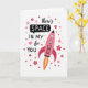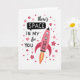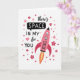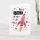 This greeting card shows a pink rocket with deep fuchsia accents curving upward, with round window dots and a small black ladder along its side. Bright orange and yellow flames trail behind it, giving the scene a fun sense of motion. The background is white, sprinkled with small stars in pink and deep red, plus a few simple flower shapes. The message reads “there’s SPACE IN MY for YOU,” with “SPACE” set inside a speech bubble near the middle. The rest of the words appear in mixed lettering styles, mostly in dark tones, and a soft pink heart sits close by to underline the loving message ❤️. In “YOU,” the “O” is replaced by a tiny heart, which makes the note feel extra caring. It feels meaningful to give because it’s like saying, “I’m making room for you in my life,” whether that’s for a partner or a close friend 🥰.