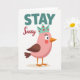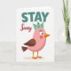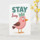 This greeting card shows a chubby pink bird standing on a white background, looking straight ahead with a confident little smirk 🥰. It wears a small mint green crown with red polka dots, tilted slightly like it knows something you don’t. The bird has one big dark eye with a bright highlight, a raised eyebrow, and rosy cheeks that make it feel full of character. Its beak and skinny legs are orange, and its wings and tail feathers are a deep brown that adds contrast. Above the bird, the word “STAY” appears in teal, all-caps letters, and right next to it “Sassy” is written in deep red, in a flowing cursive style. The text sits near the top and slightly overlaps the crown, tying the message to the bird’s attitude. A soft beige shadow under the bird grounds the scene and keeps it from feeling flat. It’s a sweet choice for someone you adore—friend or partner—because it says “I love you as you are” in a simple, funny way ❤️, and it’s perfect for sharing Valentine’s Day sentiments.