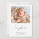 This simply charming custom photo birth announcement card features a contemporary design that lets you easily customize it to suit your style. We've picked standard sharp corners as the default card shape, but you can easily change this to rounded corners, as that look also works wonderfully with this design. So try both looks in editing mode and see which grabs you! We've given this minimalist design a splash of panache with the space for your child's first name below the front photo in a casual modern font that has a warm and familiar flair. You might choose to change this to a different font or change the color, etc. You can change the color and font of this or any other text on either side according to your own taste. The default color for the text on both sides of the card is a slightly softened black. If you prefer a more minimalist look, you can delete without replacing any of our sample stats on the front-you might not want to include the time of day or length, or delete the 'welcomed by......' line of text without replacing it with your own names, since you can include your names on the back of the card, for example. We've set the background on both sides as transparent, to let the color of your paper simply serve as the base tone. You can change this on one or both sides by choosing a color instead. We placed a sample photo on the back as well, to give you the option of including two of your photos on this card, one on each side. So please remember to replace both sample photos with your own pictures. Or you might prefer to delete the sample photo on the back without replacing it with your own photo, using that space for a message, etc. We've put some sample text below the sample photo on the back for you to replace with your own message as you see fit, but please don't feel restricted by this. If you prefer delete our sample text entirely and keep that part of the card totally blank so that you can write a handwritten note on the back of each card instead, you can do that. Or you might want to replace our text with your own message and write your own closing and then hand sign your names when you receive the cards. In any case, please do remember to remove all of the sample/placeholder text and photos on both sides, The default paper type, matte, has a soft warmth to it and resists smudging, so it's a great choice for writing your own message. You can of course change this to another paper type to suit your style. Use the intuitive design tools, your favorite photos and your inspiration to personalize this custom birth announcement card and make it uniquely yours!