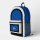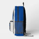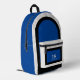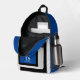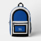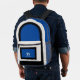 This sporty backpack design has classic design elements of a bold contrasting color block geometric rectangular and arched frames in bright blue and black over an off-white background. A text template is included with monogram initials and name to personalize as you like. This look is stylish and sporty, yet simple and modern with a retro vibe and popular gender neutral appeal.