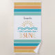 Celebrate summer vacations or a girl’s beach get-away with this fun beach towel that features a simple illustration of the sun and ocean waves, bold tropical colored stripes, and two customizable text placeholders. Add a name plus additional text go create a fun keepsake that will bring back happy vacation memories each time you reach for this towel.