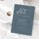 Minimalistic surprise birthday party invitation card featuring script text that says "shhh... it's a surprise!" at the top. Background is slate blue.
