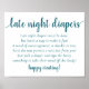 Fun way to give new parents advice and laughs with this vertical late night diapers well wishes table sign: Simple shower or gender reveal party flourish calligraphy sign featuring a fun, casual hand-lettered script. The classic design includes a modern handlettered quote typography overlay with poem. For other colors or matching products, please visit the JustFharryn Zazzle store, or contact the designer, c/o Fharryn@yahoo.com All rights reserved. #bohochic #zazzlemade