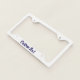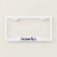 This white license plate frame has text in dark blue script. Text can be edited or deleted.