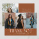 Modern and elegant graduation announcement photo card featuring 3 photos on the front and 1 on the back. The text says "THANK YOU." Add the graduate's name, information, and message to personalize this card. Terracotta color.