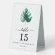 Modern wedding table number tent design featuring watercolor monstera green leaf illustration on a simple white background.