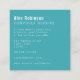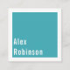 A simple and minimalist design with your name written in white on a turquoise blue background on the front, highlighted with a white border. On the back, there is plenty of space for your details in white on a blue background.